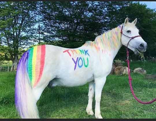 “My daughter works at Mount lodge Care farm and I volunteer to help out on Saturdays. The care farm supports adults and children with learning difficulties, and we have our own young farmers club too. We have been keeping connected with the guys through zoom video chats and we play online games and have been sending out packs in the post of activities to keep everyone busy. My daughter is also lucky enough to ride at the farm and last week Topper the therapy pony paid tribute to the NHS.”